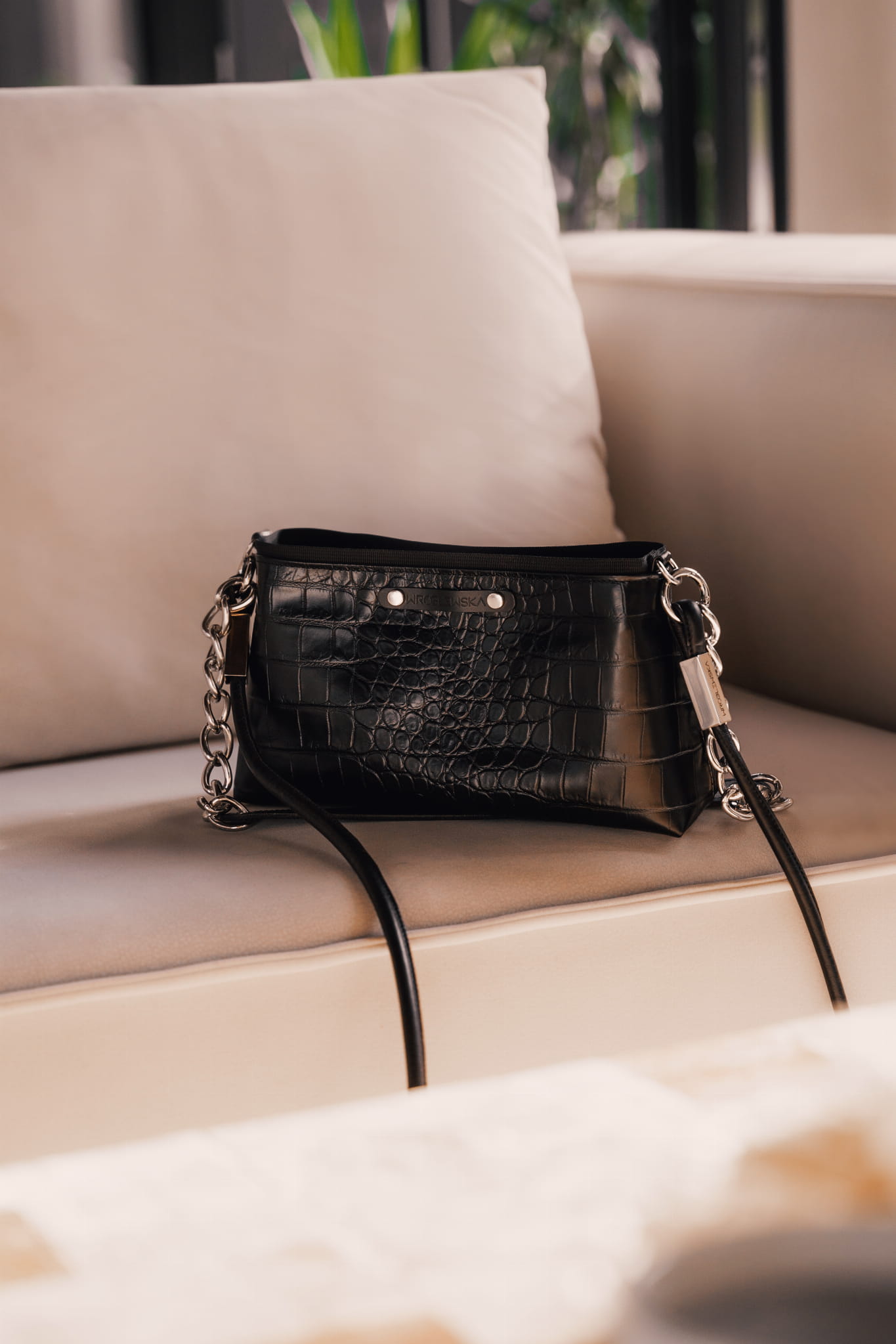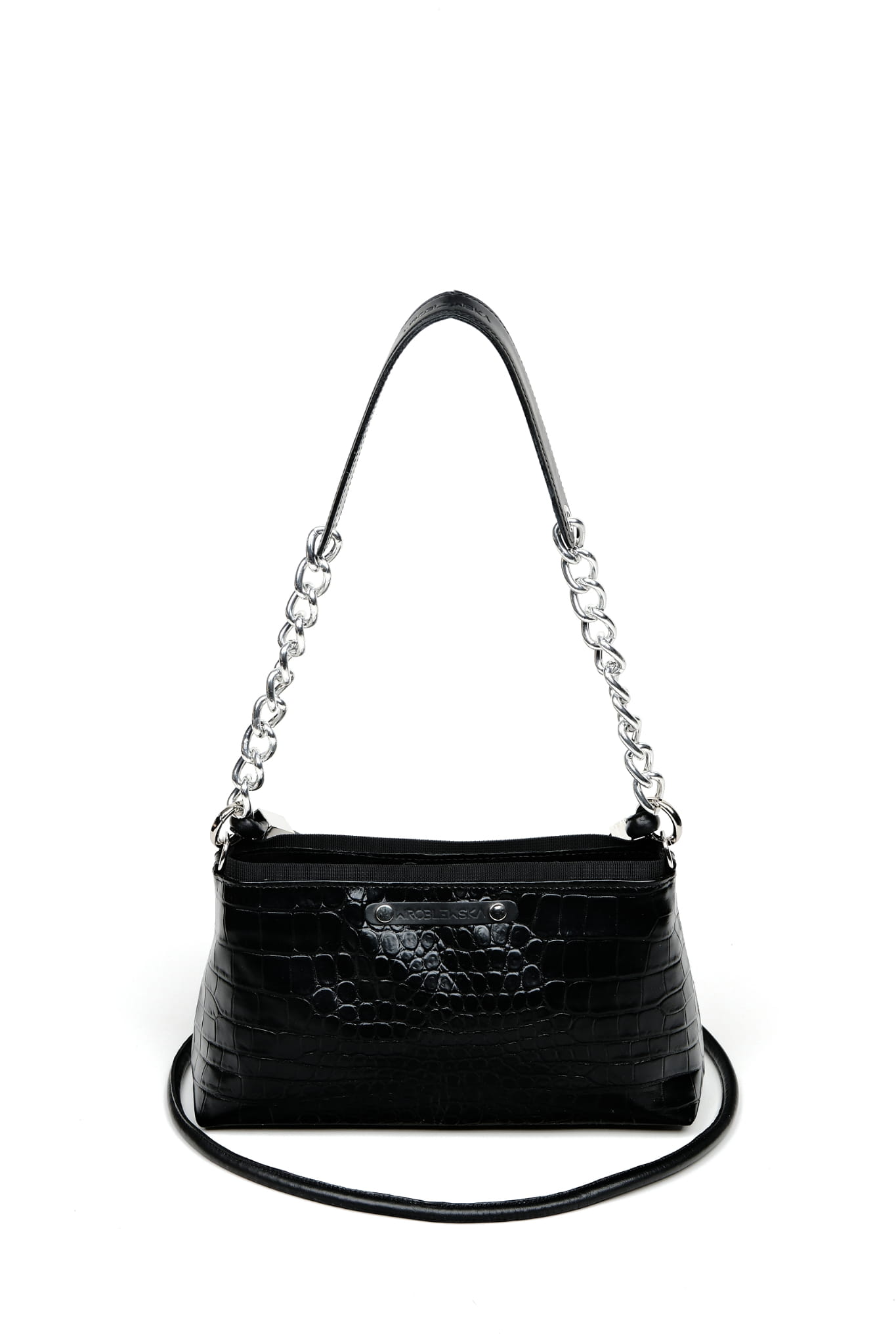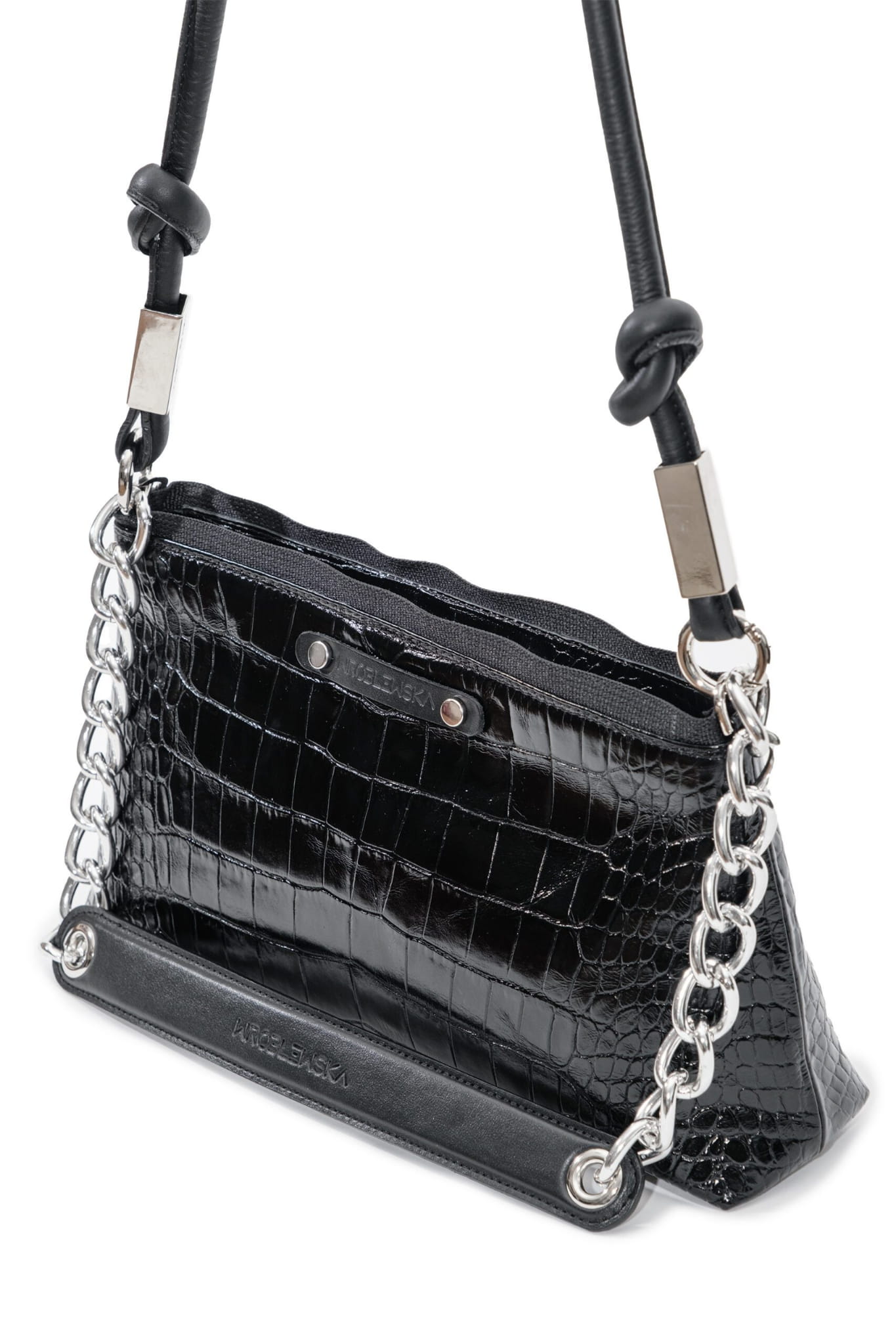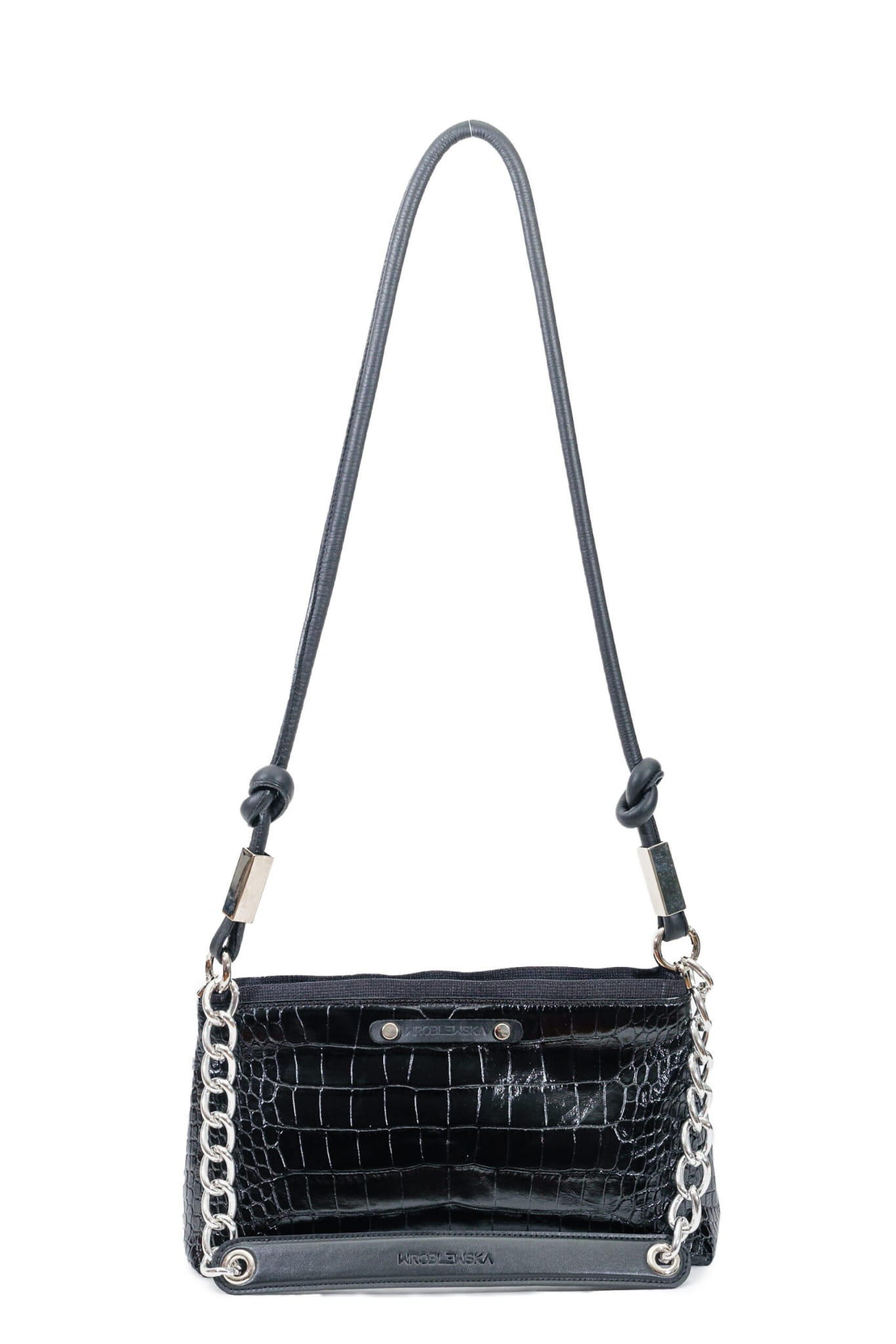 W komplecie do tej torebki znajdziesz skórzany długi pasek o okrągłym przekroju, który można z łatwością odpiąć i wymienić. Pasek posiada regulację długości za pomocą ozdobnych supełków charakterystycznych dla marki Wróblewska. Na froncie znajduje się czarny skórzany pasek z dyskretnym, tłoczonym logiem marki. Torebka posiada także krótszy pasek przeznaczony do noszenia w dłoni. Pasek ten posiada ozdobny srebrny łańcuch. Srebrne metalowe elementy okuciowe wykonane zostały z poszanowaniem jakości przez włoskiego producenta. Szerokie dno tego produktu sprawia, że pomimo kompaktowego kształtu, jest bardzo pojemny. Produkt wykonany rzemieślniczo w Polsce. Wybierając go wspierasz rozwój lokalnej marki i przemysłu galanteryjnego w Polsce.