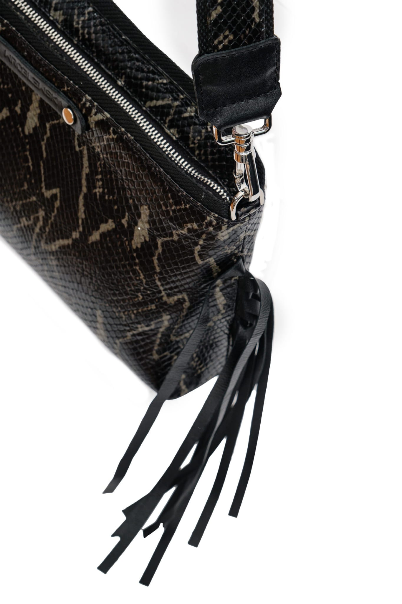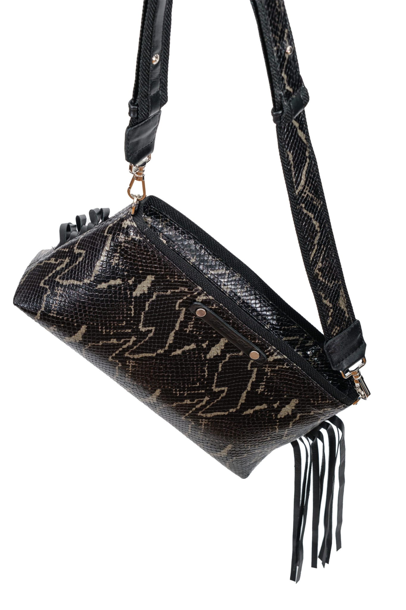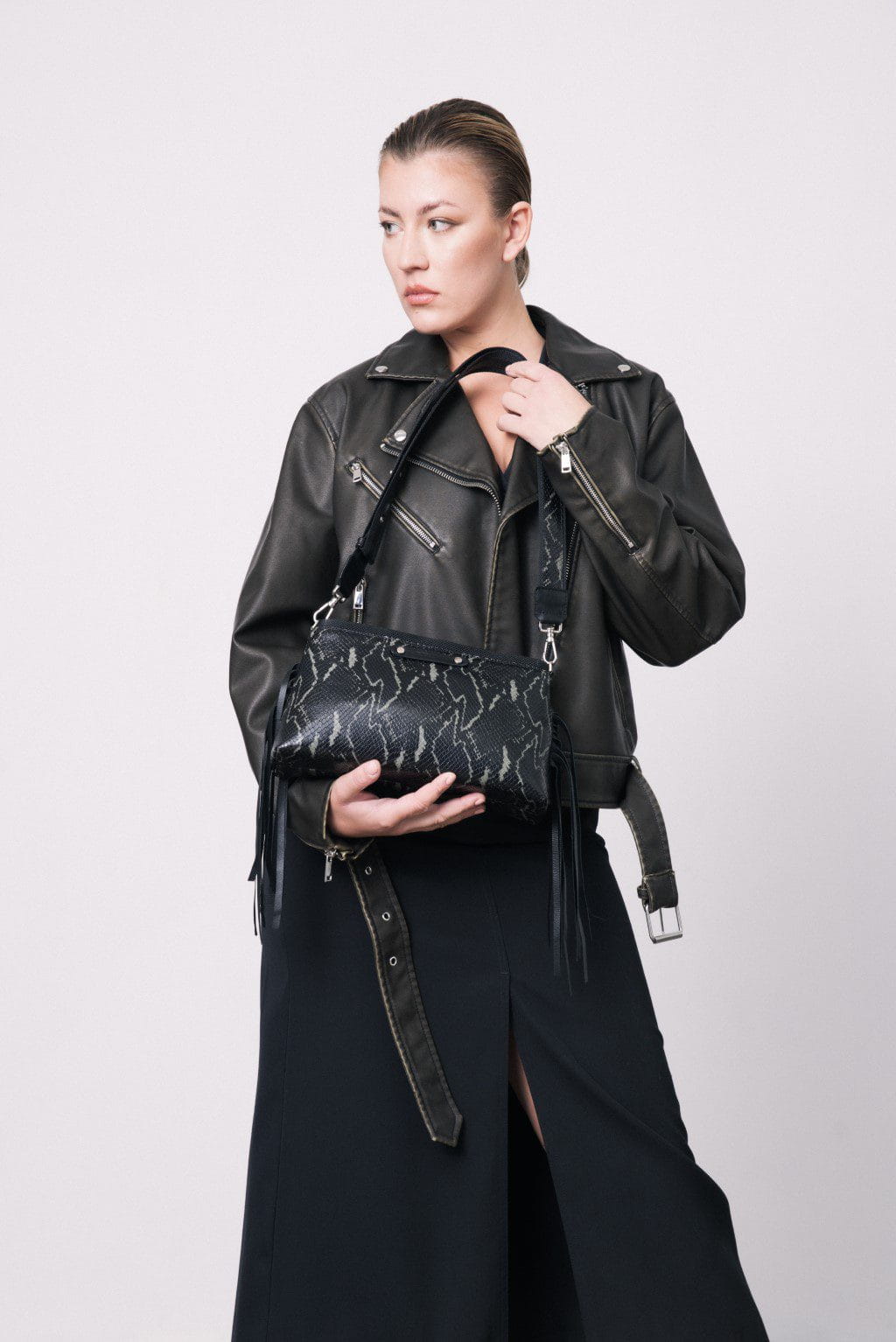 Torebka wykonana ze skóry naturalnej tłoczonej i barwionej we wzór węża (kolor czarny i oliwkowy). Krawędź torebki wykończona jest ekologiczną taśmą. Wnętrze jest chronione dzięki zapięciu na wysokiej jakości, niezawodny suwak błyskawiczny. Wewnątrz znajduje się praktyczna kieszonka również zapinana na suwak. Środek wykończony został bawełnianą podszewką.