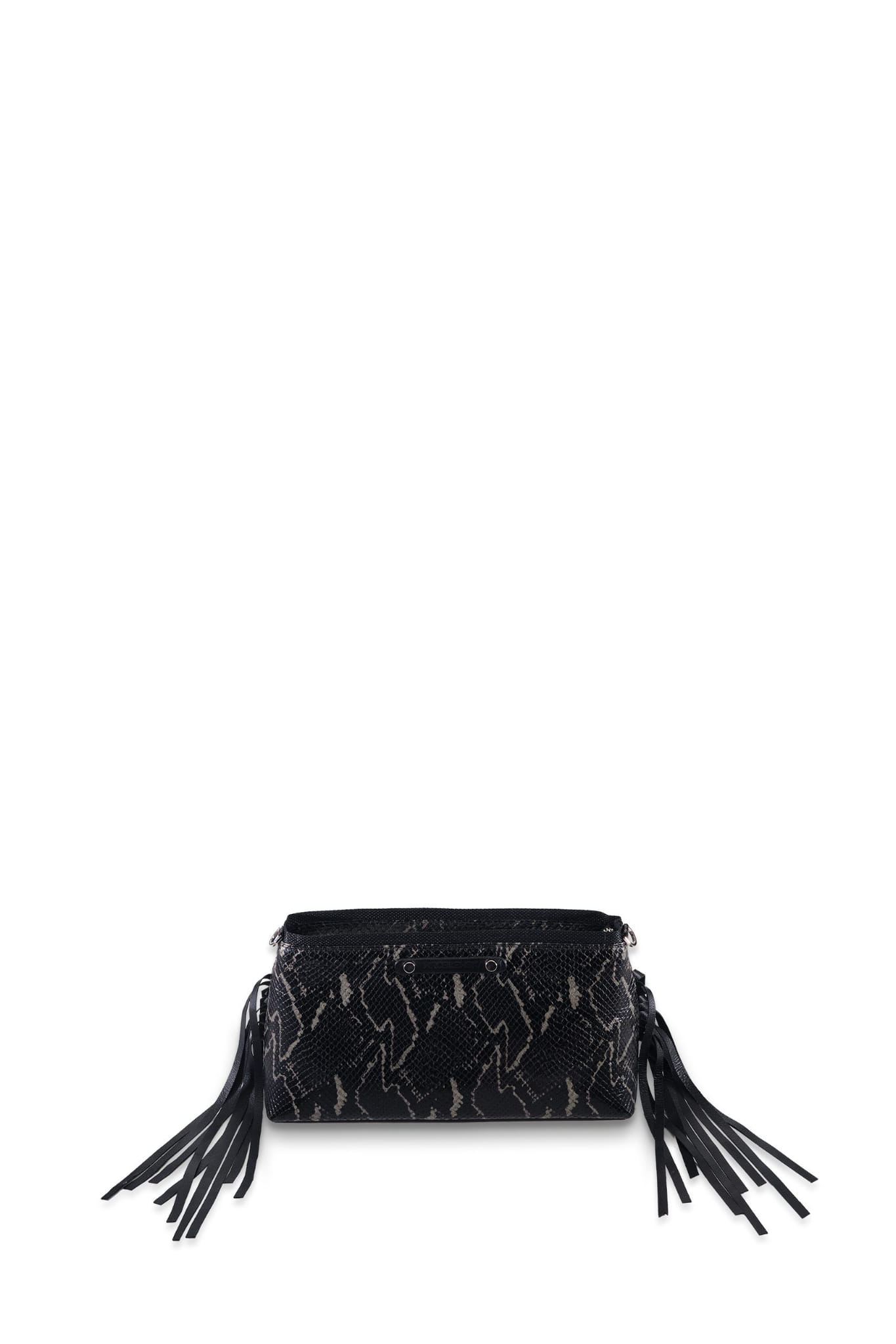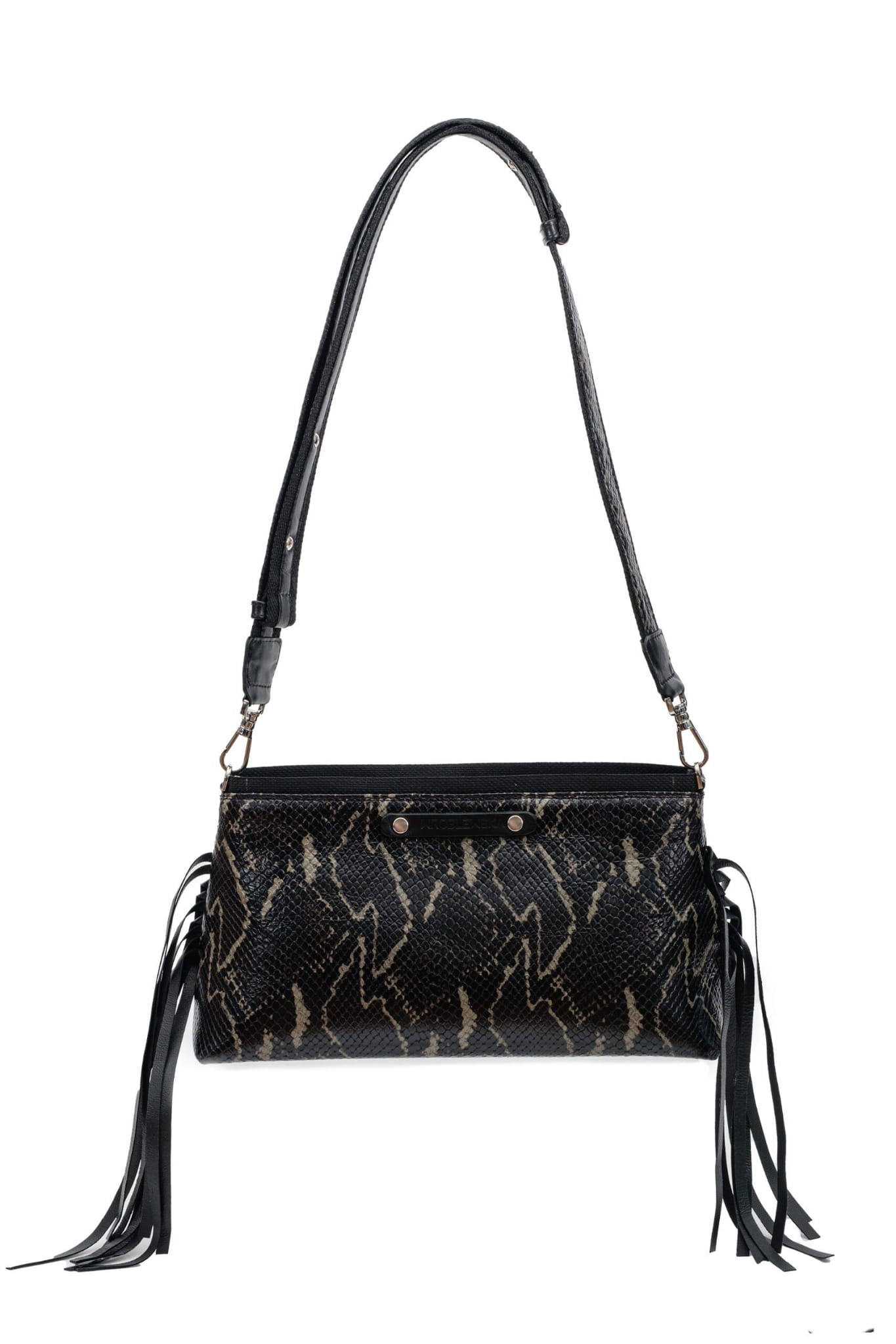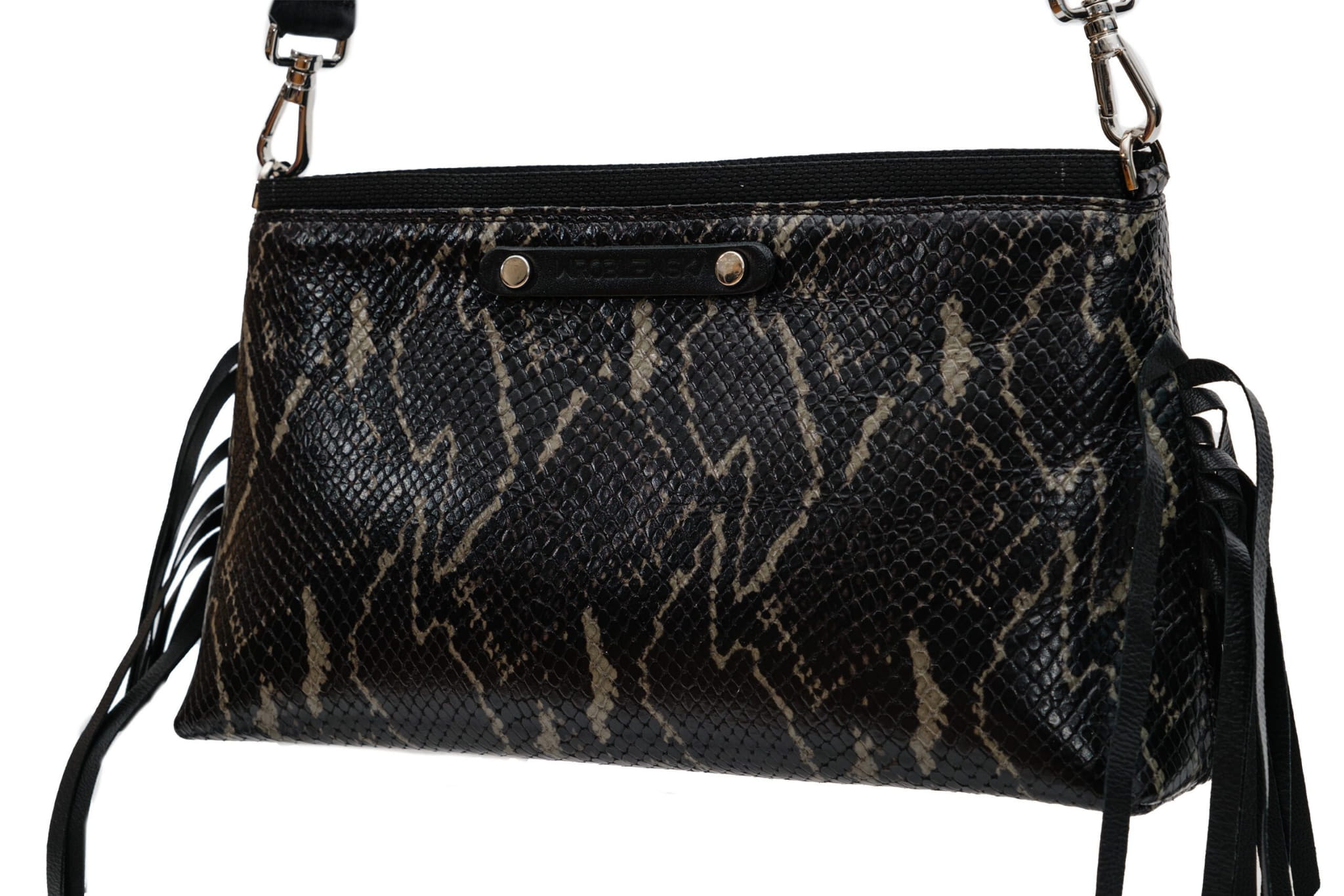 Torebka wykonana ze skóry naturalnej tłoczonej i barwionej we wzór węża (kolor czarny i oliwkowy). Krawędź torebki wykończona jest ekologiczną taśmą. Wnętrze jest chronione dzięki zapięciu na wysokiej jakości, niezawodny suwak błyskawiczny. Wewnątrz znajduje się praktyczna kieszonka również zapinana na suwak. Środek wykończony został bawełnianą podszewką.