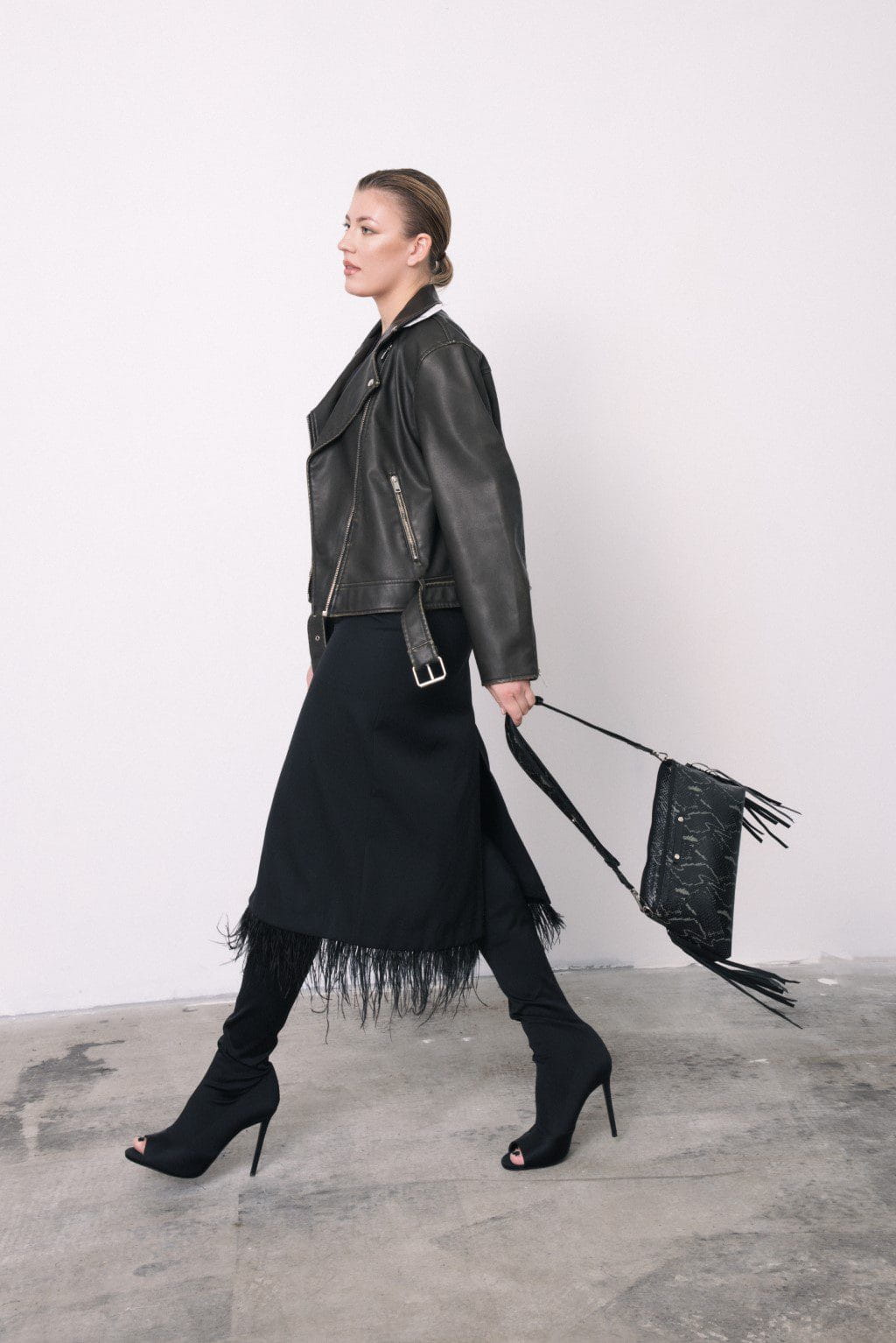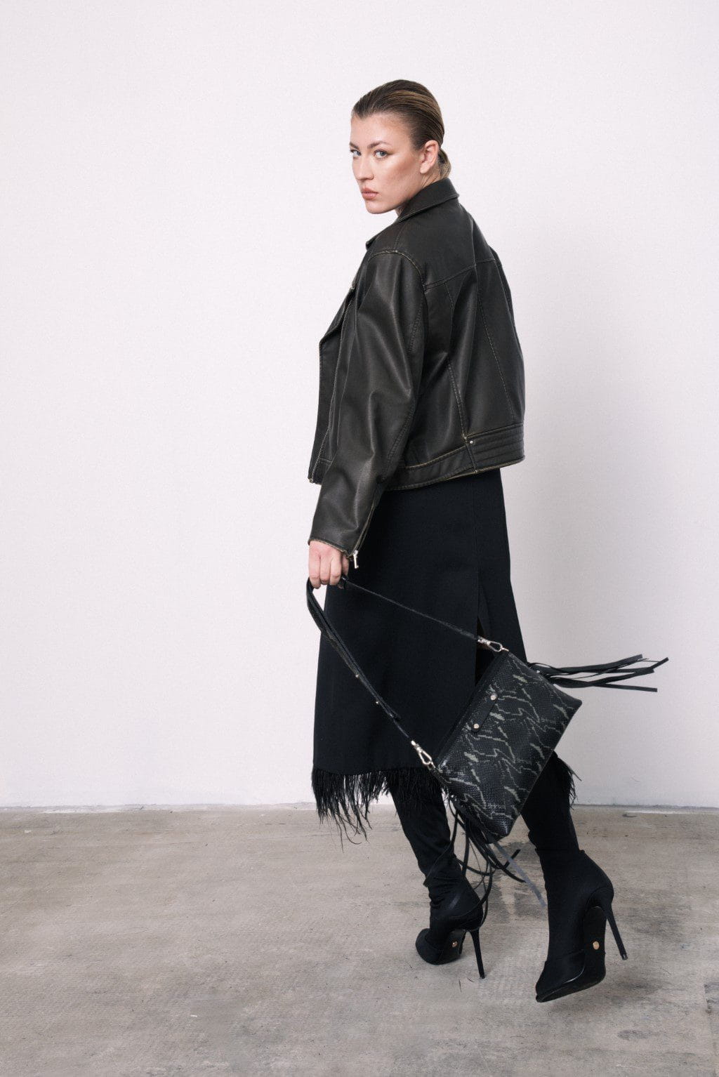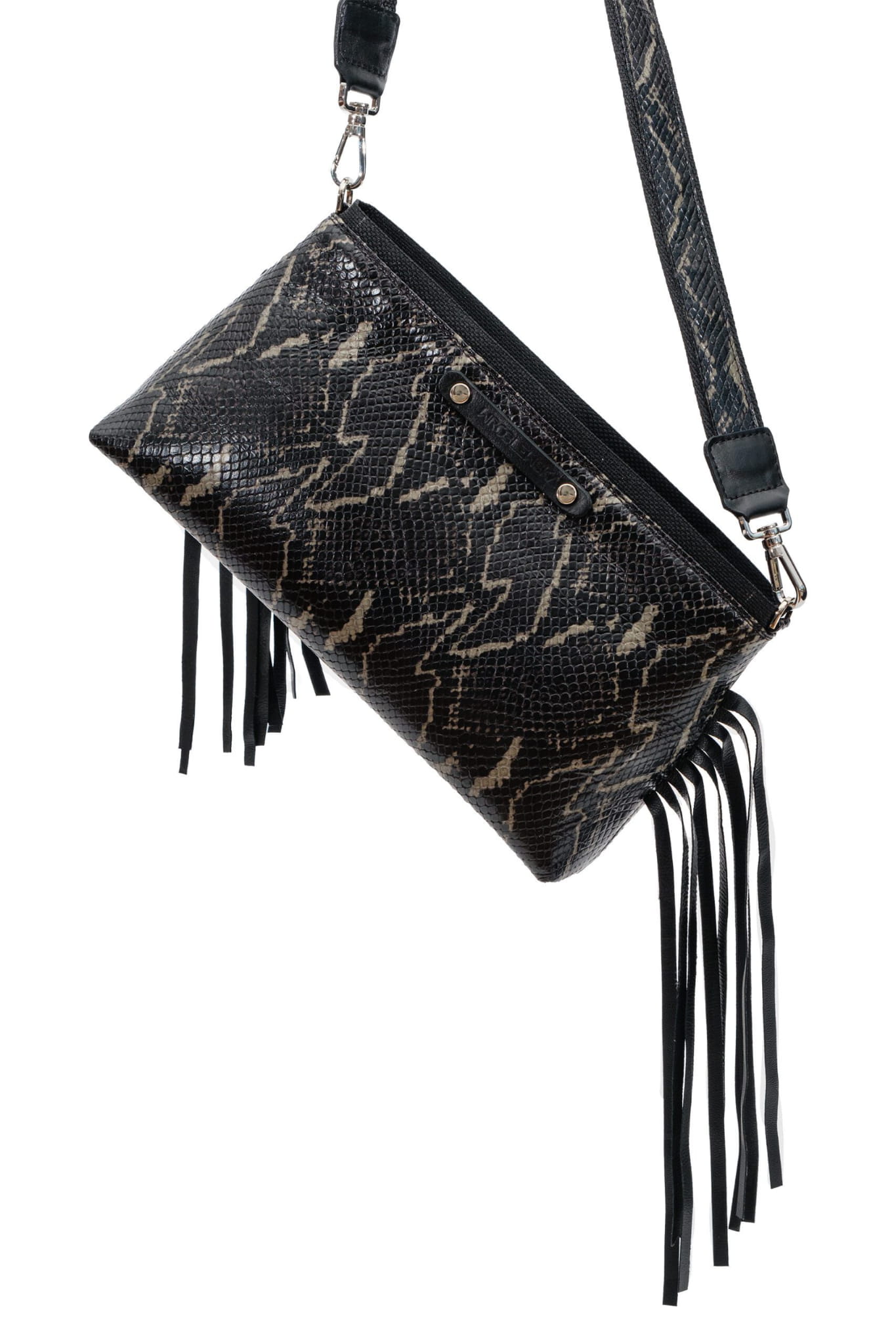 W komplecie do tej torebki znajdziesz skórzany długi pasek, który można z łatwością odpiąć i wymienić. Pasek posiada regulację długości za pomocą srebrnych knopików. Po bokach ozdobne, czarne frędzle wykonane ręcznie z naturalnej skóry. Srebrne metalowe elementy okuciowe wykonane zostały z poszanowaniem jakości przez włoskiego producenta. Produkt wykonany rzemieślniczo w Polsce. Wybierając go wspierasz rozwój lokalnej marki i przemysłu galanteryjnego w Polsce.